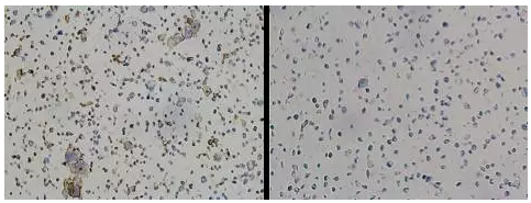 18. 將顯色液滴加于切片上,于顯微鏡(10倍目鏡)下觀察染色情況,待看到棕黃色陽性沉積,且背景不深時,將切片浸沒于ddH2O中,終止染色。