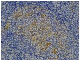 在馬同學(xué)的人淋巴結(jié)石蠟切片上,也觀察到了陽性染色。